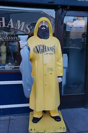 - Sculpture along the promenade, such as High tide in short wellies aka Finlay, the great steel fisherman.