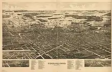 Findlay is a city of 41,000 people (2018) in Northwest Ohio. This former oil and gas town is the seat of Hancock County, and home to the University of Findlay. The city has a distinct mix of amenities aimed at the working class and academics, almost universally housed in historic architecture.