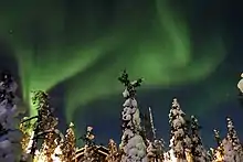Spotting the eerie northern lights (aurora borealis, Finnish: revontulet) glowing in the winter sky is on the agenda of many visitors. Northern Lapland is one of the best places to observe aurorae, as it has good accessibility, high-quality accommodation and a nearly continental climate with relatively clear skies. The probability of some northern lights is 50–70 % (most often 22:00–24:00) any night with clear skies, and light pollution is quite easy to avoid here – but there are cloudy periods, so do not count on seeing them.