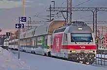 Trains will get you to the towns, most notably to the provincial capital Rovaniemi at the Arctic Circle, or to the northernmost railway station in Kolari. The overnight trains from the south have sleepers and some also take cars. There are two kinds of sleeper trains: the old "blue" pikajuna, mostly used as a complement in peak season, and the modern two-storey ones. The old ones have 3-person cabins and no showers, the new ones 2-person cabins, some of which can be combined for a family, and shared or en-suite showers. There is a cabin for a wheelchair user and an accompanying person in each modern sleeper, and one for those travelling with a pet. During COVID-19, you always get the cabin for yourselves, so filling it up saves in price. The price for a journey from the south to Rovaniemi or Kemijärvi for two people in a sleeper cabin is about €150–300.