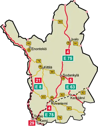 - To Rovaniemi, Kemijärvi, Sodankylä, Ivalo: E4 to Tornio, a short leg south along E8, then E75