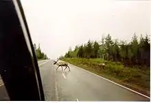 Unlike moose, which usually runs to the road suddenly and alone, the reindeer hang around peacefully in groups and collisions are usually easy to avoid if slowing down at once when the first reindeer appear in sight (drive carefully, as they may suddenly regroup in front of your car).