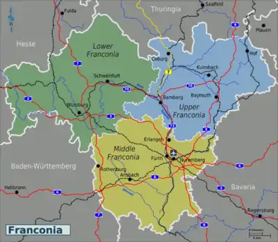 Franconia used to be comprised of many independent principalities and petty duchies and knighthoods until it became part of Bavaria around 1806 (different territories were annexed by the Wittelsbachs at different times but 1806 is the commonly accepted "overall" date) as a result of the Napoleonic Wars. This has two main consequences: first, the dialect and religious composition of two neighbouring villages may be notably different (which used to cause tensions but is now of mostly folkloric interest); second, there is still some resentment towards Bavaria and many people do not like to be lumped together with their "colonisers" down south. While you will not encounter open hostility, try to avoid calling Franconians Bavarian. Many people also include part(s) of adjacent Länder in Franconia as they are linguistically, culturally and historically more connected to Franconia than to the Länder to which they belong in terms of administration. Those regions include: Sonneberg and Thüringen south of the Rennsteig (in fact Sonneberg voted to join the Nuremberg Metropolregion and there are talks of switching Bundesland) and the region of Baden-Württemberg called Heilbronn-Franken. On the other hand places like Aschaffenburg are linguistically close to neighbouring regions. Coburg in turn was one of the several petty states that were considered "Thuringia" prior to its creation in early Weimar times, but decided in a 1920 referendum to join the state of Bavaria rather than Thuringia, in part due to feeling more Franconian than Thuringian. In short, the cultural borders are a bit fuzzy around the edges.
