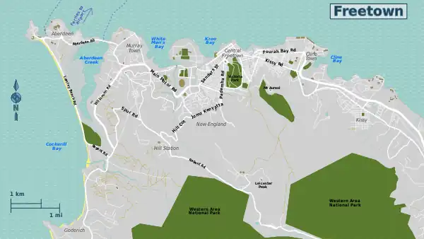 Freetown is the capital city of Sierra Leone and is the heart of the Western region, with around a million inhabitants. It is on a peninsula on the south bank of the estuary of the Sierra Leone River. The city lies at the foot of the peninsula mountains and faces one of the best natural harbours on the west coast of Africa. The peninsula is home to some of the finest beaches in Africa - Lumley Beach, Lakka Beach, No. 2 River Beach and Toke Beach are some examples.