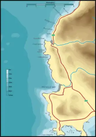 The dive sites from Bikini Beach to Lorry Bay are along this part of the coast, and are more sheltered from south westerly swell than sites further to the south as a result of the orientation of the coastline approximately parallel to the swell direction.