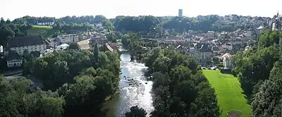 - 🌍 Zaehringen Bridge (Pont de Zaehringen) (From SBB, bus 2 or 6 to 'Pont Zaehringen'). The original suspension bridge was built in 1834 and replaced in 1924 with concrete. The bridge is 165m long and spans the Sarine River. There is a footpath beneath the roadway. To get a clear view of the bridge try the Bern Gate or Bern Bridge.