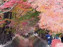 - 🌍 Momiji Tunnel (紅葉トンネル, Momiji tonneru) (on the north shore; on foot, from the last stop of the Retro Bus, walk (carefully) to the west along the road (no side-walk)). In autumn, the beautiful orange and yellow tones of changing leaves ("momiji") are beautiful, and there is also a nice view on the lake and the mount Fuji.