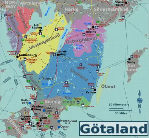 Götaland is the southernmost of the three Lands of Sweden. Officially it also covers Scania and Gotland, which are however separately treated in this travel guide.