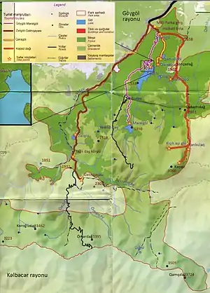 - Göygöl-Maralgöl (pink). Distance: 14 km, Altitude range: 779 m, Total climb: 890 m, Total descent: 111 m. Duration: 4 hr (one way). Grade: Easy. Recommended: comfortable clothes for walking, drinking water. Instead of starting at the park office, it is better to take a ride up until Göygöl lake and save 1-1½ hr. Note, from Maralgöl it is possible to continue (experienced) hiking further into the mountains, heading towards the Kəpəz dağı trail—beware of the Shepard dogs though.