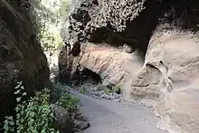 - 🌍 Barranco de Badajoz, Camino la Ladera (follow the concrete paved road with the quarry to the right and vineyards to the left, until it changes into a dirt road; there are 🌍 parking spots at the last vineyard; the closest bus stop is 🌍 Barranco de Badajoz). 24/7. A ravine with archaeological evidence of Guanche activity, including several Guanche mummies. There are many legends of people experiencing supernatural phenomena when visiting the ravine late in the evening or staying the night. Some people claim to have seen angels, UFOs, strange orbs or fireballs, and so on. Whatever may or may not be true of those, the natural beauty of the area makes it worth a visit. There is also industrial heritage to be discovered, with 6 mine shafts, aquaducts, and ruins of buildings spread along the length of the ravine. As of 2019, a land slide blocks the path about 100 m before the end of the ravine, restricting access. The riverbed is dry in summer. None of the mine shafts are accessible, with sings warning that the atmopshere down the shafts is not breathable. Free.
