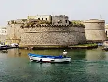 - π Angevin-Aragonese Castle (Castello angioino-aragonese), Riviera Armando Diaz, β +39 0833 262775. 10:00-00:00. A wooden drawbridge permits the entry to this imposing defensive structure of the 11th century, rebuilt and restored several times. It is border by the sea on three sides, while the semi-circular bastion, overlooking the modern centre, is completely surrounded by the waters of the Seno del Canneto (Cove of the Cane field).