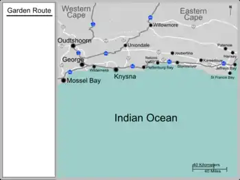 The Garden Route is bounded on the south by the coastline of the Indian ocean, and to the north by the Outeniqua and Tsitsikamma Mountains.
