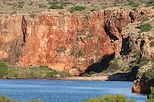 The British dominated subsequent exploration and settlement, eyeing the local pearls. In 1839 they named the Gascoyne river for Captain John Gascoyne RN, a missionary, and son of Bamber Gascoyne a Lord Commissioner of the Admiralty, the sort of fellow you wanted to keep in with. (The TV presenter Bamber Gascoigne (1935-2022) was his direct descendant.) This river only visibly flows for four months of the year, but seeps continuously underground through the sandstone and limestone aquifer. You wouldn't have to drill down very far to furnish your farm with a water supply. So although the region is not as pastoral as further south, it's suitable for sheep and cattle at low density, gnawing the scrub. By the end of the 19th century Gascoyne was parcelled into sheep-ranges, and the port of Carnarvon sprang up. That town maybe had a lucky escape, being named for the 4th Earl of Carnarvon, better known to his chums as "Twitters".