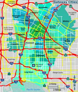 The largely suburban and industrial Gateway Cities of Los Angeles County in Southern California make up the southeastern portion of the county, lying between the City of Los Angeles proper and the border of the county with Orange County.