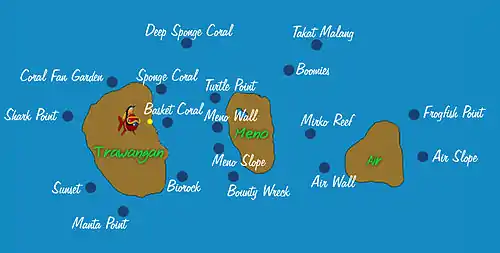 There is good diving around the islands, suitable for all levels, the islands being globally known as a proficient teaching center for beginners right up to instructor level. Technical diving courses are also available. An impressive array of marine life is present, such as green and hawksbill turtles, bumphead parrotfish, black-tip and white-tip reef sharks and more. There are also some great muckdiving sites for macro photographers, a Japanese wreck for deep diving and biorock artificial reefs which may interest environmental enthusiasts. Visibility is commonly in the 15-30 m range. Due to the exposed position of the Gilis, currents can be quite strong and drift diving is the norm. Some of the dive sites have unfortunately been damaged over the years due to a combination of human and environmental causes, especially from an increase in water temperatures from El Niño in 1998 and unsustainable local fishing practices. Since 2000, fishing has been regulated around the islands, allowing the reefs and fish population to slowly regenerate.