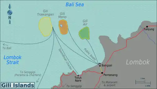 - Gili Gili Operating routes from Serangan and Padang Bai to Gili Trawangan via Teluk Nare (Lombok) and Gili Air.