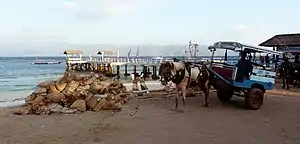 There is no motorised transport on the islands. Your options are horse-drawn carts, known as cidomos, and bicycles, which are available for rent all over the islands. The price for tourists is Rp 20,000-50,000 per head, depending on the length of the journey. To go all the way around the islands could cost up to Rp 150,000. However, as the islands are only a few km in diameter, it's entirely possible to just walk instead.