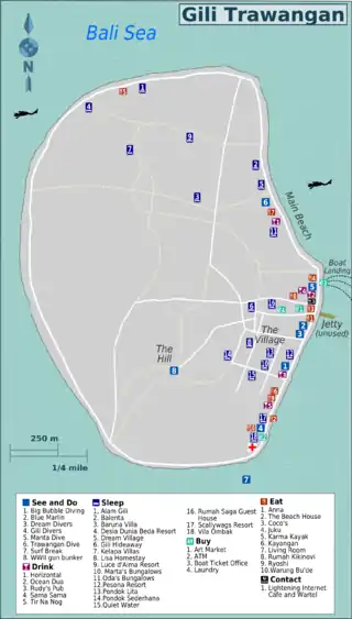 - Manta Dive, ☏ +62 370 6143649, info@manta-dive.com. One of the longest established dive operators with international staff. The only 5-star SSI Diamond Instructor Training Facility in the region. All PADI and SSI courses are provided in main European languages, including introduction dives and Scuba Ranger courses for children. Daily dive trips around all 3 Gili Islands and frequent muck-dive trips to neighbouring Lombok. The dive school has direct access to the beach and boat. 8 traditional and 3 modern bungalows, café serving breakfast and lunch, free WiFi and freshwater swimming pool. A rustic beach bar serves sandwiches, salads and breakfasts. Also has a shop on Gili Air.