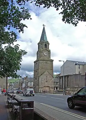 - 🌍 Stumpy Tower (Auld Stumpy), Knockcushan St (corner of Dalrymple St). This was completed in 1827 to house the courts, police station and town jail; it replaced a 1789 jail which, having a thatched roof, never retained its prisoners long. The tower was decommissioned in 1871 but left standing as it carried the town clock. In 1911 the town hall was built around it, but this burned down and the area was cleared, so Auld Stumpy now stands in isolation.