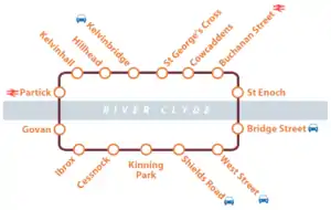 It's described as an inner and outer circle but that just means the direction of travel, with the outer circle running clockwise. Going anti-clockwise on the inner circle, the Subway runs from the city centre to West End and Glasgow University, south under the Clyde to Ibrox Stadium then back into the city, with each orbit taking 24 min. Use St Enoch for Central and Argyle St stations, and Buchanan St for the bus station and Queen Street station. No bikes are carried, and wheeled access to platforms is limited.