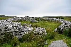 - St Columba's Church (C of I) was built in 1828. There's a 10 m stone set into the west wall of the graveyard which was probably part of a court tomb (like Cloghanmore, below) then was used for monastic buildings. There's also scraps of an 8th century souterrain. The east side of the graveyard is Catholic, with an intricately carved pillar, now broken. 100 m west of the church is a 1.85 m stone pillar inscribed with a cross.
