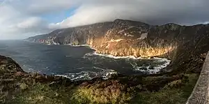 - 🌍 Slieve League or Sliabh Liag is a mountain of 596 m / 1955 ft, with its south face etched into great sea-cliffs. The usual viewing point is Bunglass: branch off R263 into Teelin. Sept-June you can drive up the narrow lane to the free car park, hoping you don't meet a campervan coming the other way, then it's an easy paved walk of 1 km. July-Aug the lane is closed to visitor cars, you have to park in Teelin and take a shuttle bus (€6). Tourist guides will bend your ear about how much higher these are than the Cliffs of Moher, but they're sloping not sheer. South across the bay is Sligo's Ben Bulben. Trails lead to the summit of Slieve League: One Man's Pass and Pilgrim's Path will get your attention as they teeter along the sharp ridge with the wind blasting up off the cliff face.