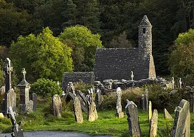Glendalough is a medieval monastery complex in County Wicklow in Ireland, 40 km south of Dublin. It's set in a deep scenic valley which is within the Wicklow Mountains National Park and has been protected from development. Most visitor facilities are therefore in nearby Laragh.