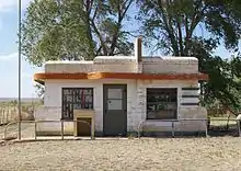 The now-abandoned post office stands in New Mexico, the rail station was in Texas.