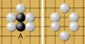 If a group of stones has no liberties (connections to empty intersections), then it is captured and its stones are taken off the board. The "before" part of the diagram shows a black group in atari; a white move at A would take its only liberty and kill the group. The "after" part shows the result of that white move. A black move at A would (at least in the short term) prevent the capture. Whether playing at A is a good idea for either player depends on the rest of the board, mainly on other stones nearby. This is one instance of a fairly general principle; if a move is good for either player, then it (or something nearby) is likely also good for the opponent.