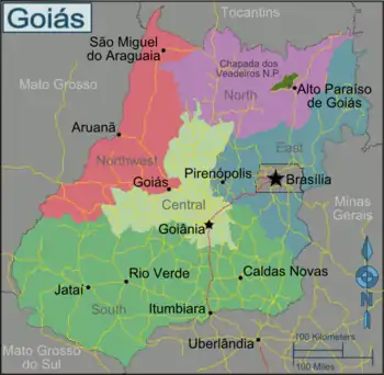 Goias (Portuguese: Goiás) is a state of Brazil, located in the Central West region of the country. The name Goiás (formerly, Goyaz) comes from the name of an indigenous community. The original word seems to have been guaiá, meaning "the same person" or "people of the same origin." Neighboring states are (from north clockwise) Tocantins, Bahia, Minas Gerais, the Federal District, Mato Grosso do Sul and Mato Grosso.