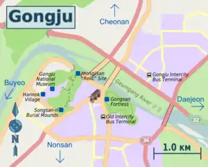 The city is 125 km from Seoul and lies on the Cheonan-Nonsan Highway (route #25); switch from the Gyeongbu Highway (route #1) at Cheonan. Gongju is also accessible via route #36 from Cheongju and route #32 from Daejeon.