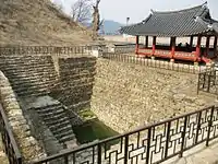 - Gongsan Fortress (Gongsanseong, 공산성). A 1,500-year-old mountain-top fortress looming over the Geumgang River. You might need a decent amount of imagination to get the most out of this place, as much of the fortress is a series fenced off grassy rectangles marking the estimated site of the ancient Baekje Royal Palace and associated structures. A decent amount of information is provided around the various sites in both Korean and English. Perhaps the most architecturally unusual part of the fortress is the Lotus Pond (Yeonji, 연지) Also contains Yeongeunsa Temple and Baekje Folk Village Land the latter of which is, much of the year, little more than a humongous carpark but hosts an annual festival (see Do). If you visit outside of the festival, it doesn't mean you can't join the locals in merrily tossing stones at the archery targets around the perimeter. Adults ₩1200.
