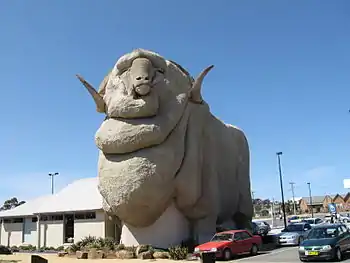 - 🌍 The Big Merino, Cnr Hume & Sowerby Streets (Just off the southern exit from the Freeway in the service centre), ☏ +61 2 4822 8013, fax: +61 2 4822 9369. M-Sa 8:30AM-5:30PM, Su 9AM-5:30PM. Possibly Goulburn's most well-known tourist attraction. Being a rural hub, the 15 m (49 ft) tall concrete Merino sheep symbolises the town's importance to the local farming industry. Stairs ascend inside the structure past mildly interesting displays on wool and merinos (Australia's most common sheep breed). Originally located in the centre of the town, when the freeway bypass meant that the merino lost visitors, in 2007 the owners put it on a truck and moved it 800 m up the road. The lookout at the top of the stairs has now been renovated to allow visitors to see out the top again. The base of the concrete ovine houses a tourist gift shop.