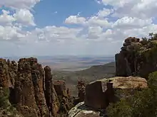 - Visit the Valley of Desolation (Head north out of Graaff-Reinet a few kilometers towards Richmond, then turn left into the reserve. Then turn left again after the entrance gate to drive south into the mountains.), ☏ +27 49 892-3453, fax: +27 49 892-3456, camdeboo@sanparks.org. The Valley of Desolation is found at the top of Camdeboo National Park, where breathtaking cliffs and columns of rock make a haven for dozens of kinds of birds. There is a steep, curving drive to the top of the mountain, with an incredible view of the area. The dry Karoo air means the view is not the least bit hazy. Best go at sundown as the shadows stretch out over the landscape. There is a 45-min hiking trail at the top, and other, longer trails within the park. R48 per adult per day (discount for South African and SADC residents).