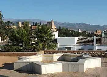 Above the main palace complex, to the east of the Generalife, are a number of visitor facilities, namely a large parking lot. A short hike uphill from the parking lot is the 🌍 Silla del Moro, the ruins of a guard outpost directly above the Generalife Palace. While it requires an uphill hike and is isolated from the rest of the grounds, the Silla offers what may be the most spectacular view in all of Granada, giving you a rare opportunity to look down at the Alhambra palace, as well as a sweeping vista of the city, the valley and the surrounding mountains, with the added benefit of not being nearly as crowded as the San Nicolas Viewpoint in the Albayzín or requiring admission like the Alcazaba.