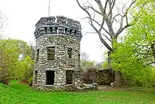 - 🌍 Gibbet Hill Castle (Bancroft's castle) (Park off Lowell Rd. just east of the Gibbet Hill Grill). Built in 1906 and ruined in 1932, Bancroft's castle is an impressive structure with a tower and overgrown stone walls. Public access is free and unrestricted, although it can be hard to find parking on nice days. There are also some good views of the area from the top of Gibbet Hill. Note that despite how it looks on the map, you cannot drive directly to the castle; park on the north side of Lowell Rd. near the stone pillars that mark the trailhead, and there is a short but steep trail up to the castle.