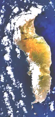 Guadalupe has a rugged landscape with numerous shield volcanoes. The island measures 35 km (22 mi) north-south and up to 9.5 km (5.9 mi) east-west, with a total area of 244 km2 (94 sq mi).