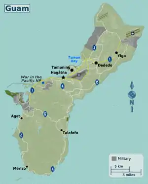 - 🌍 War in the Pacific National Historical Park - former battlefields, gun emplacements, trenches, and historic structures all serve as silent reminders of the bloody World War II battles that ensued on Guam. While the park is known for its historical resources, the warm climate, sandy beaches, and turquoise waters attract visitors and residents. See Pacific War for background.