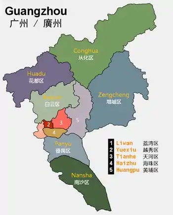 Like many Chinese cities, Guangzhou municipality includes a vast rural area in addition to the urban core. There are 11 districts in Guangzhou. Among them, Liwan, Yuexiu, Tianhe are the city's core, of most interest to tourists.