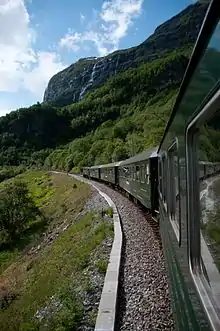 • 🌍 Flåm railway (Flåmsbana), +47 57632100, fax: +47 57632350, . This railway climbs from sealevel to 866 m (2841 ft) in 20 km (12 mi), making it the third steepest normal railroad in the world. The railway is an engineering achievement. Several switchbacks are needed to climb the steep valley, one tight switchback is inside a tunnel. One tunnel, known as the Shelf, has a "window" allowing view from within. The switchback system at one point creates 3 or 4 levels of rail stacked up. The rail was opened in 1940 after 17 years of construction. Tunnels were largely built by hand and 1000 meters required 10 years labour. With 5,5 % gradient it is one of the steepest rail tracks in the world. View of high mountains and waterfalls through the gorge-like valley. A power station was built at the waterfall to provide electricity for the trains. Single ticket: Adults: kr 300, Children: kr 150, kr 210 for holder of Eurail and InterRail; Return ticket: Adults: kr 400, Children: kr 300.