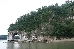- 🌍 Elephant Trunk Hill (象鼻山; Xiàngbíshān), Binjiang Rd (滨江路; Bīnjiānglù) (in Xiangshan Park (象山公园) on the banks of the Li River, within walking distance of the town center and near to bus routes 23 and 16), ☏ +86 773 2803000. 07:00-22:00. Hill with a large natural arch cut into it. This resembles the trunk of an elephant dipping into the river. This scene is frequently used as a symbol of the city and so has developed some fame. There is a fun and cheaper alternative to get into the park, you can go all the way to the river on the street just at the right side of the west gate, you will find some people asking if you want a boat that they drop you in the park for half-price of the official ticket. It is pretty much impossible to get a good view of the natural arch without going on a boat tour as trees have been planted to prevent people from freeloading the view. ¥75.