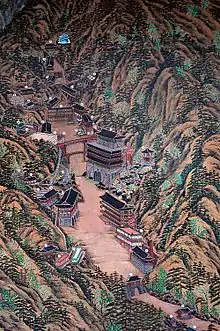 - Great Teacher Hall, 대조사전 Daejosajeon, 2. A shrine erected in the memory of Sangwol Wongak, a large statue of whom can be found inside.