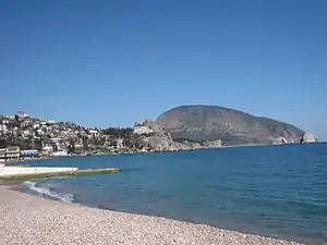Ayu-Dag (Crimean Tatar: Ayuv Dağ Russian: Аю-Даг, Медведь-гора, Ukrainian: Аю-Даг means "Bear Mountain" in all three languages) is a nearby coastal peak and nature reserve. Its 572 m summit can be scaled from the Artek children's camp which lies at its base. Take minibus number 2 to Artek and find the trail up from there.
