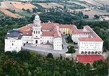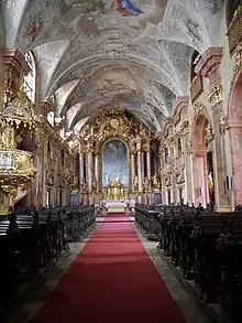 • 🌍 Benedictine Church (Loyolai Szent Ignác Bencés templom), Széchényi tér, 11 (city centre). Early Baroque, built between 1634 and 1641. The nave was decorated in the middle of the 18th century; the main altar-piece (The apotheosis of Saint Ignatius), the ceiling pictures of the sanctuary and the nave (The ascension of Saint Ignatius, Angelic salutation) were painted by Pál Troger. The beautiful baroque pulpit made in 1749, while the organ case is from 1755.