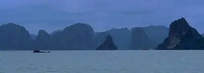 Ha Long Bay (also "Halong Bay"; Vietnamese: Vịnh Hạ Long) is in northern Vietnam, 170 km (105 mi) east of Hanoi. The bay is famous for its scenic ocean karst topography and is often included on lists of natural wonders of the world, including the UNESCO World Heritage list.