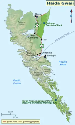 - ๐ Daajing Giids-Skidegate โ neighbouring settlements of Daajing Giids (formerly Queen Charlotte) and Skidegate; the arrival point for ferries from the Mainland, and main tourist centre