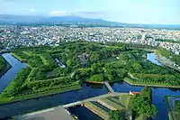 - 🌍 Fort Goryōkaku (五稜郭) (Streetcar Goryōkaku-kōen-mae (五稜郭公園前) stop). A star-shaped fort, a symbolic site to the city itself. Completed in 1864, this was Japan's first Western-style fortress and finished just in time for it to be occupied by the Ezo Republic as their headquarters. It never saw any action though, as the rebels surrendered peacefully. Most of the fort was consequently demolished and this is now a large park and popular cherry-blossom spot in spring. The fort also houses a small museum with exhibits on local history (rotating each year). (JR Goryōkaku station is not near to Goryōkaku. Tram or bus are recommended.)