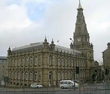 Halifax is a large market town within the Metropolitan Borough of Calderdale, in West Yorkshire, England, with a population of around 90,000 in 2021. It is well known as a centre of England's woollen manufacture from the 15th century onward, which dealt through the Halifax Piece Hall. It is internationally famous for its Mackintosh chocolate and toffee (now owned by NestlΓ©), the Halifax Bank, Halifax RLFC, The Gibbet and Shibden Hall.