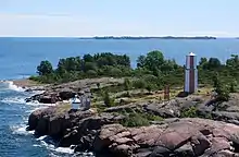 Before Purunpää there is an opening between the islands to Gullkrona fjärd, and the outer route leads north-west via 🌍 Helsingholmen 4 M away. The harbour is in a bay on the north side, use the 2.4 m fairway to get there, otherwise there is a narrow passage by its south-west shore.