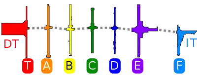 ATL's efficient layout: ribs connected by a spine. Domestic Terminal (DT) is on the west end, and International Terminal (IT) is on the east end. The dotted line is the Transportation Mall and Plane Train.